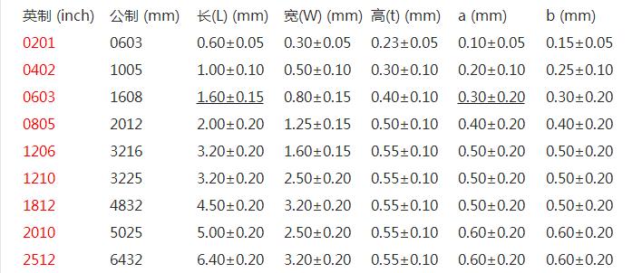 國內通用尺寸表示是(長*寬)1.6*0.8mm(單位為mm).國際上通用尺寸表示是用英0603(單位為inch),